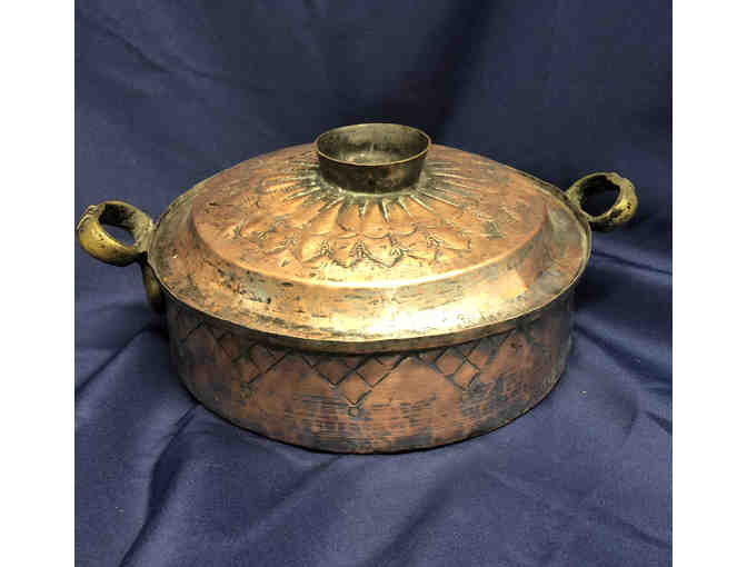 This cooking pot can be used on your stove or as displayed art. It holds over 3 quarts. It is hand hammered and etched.