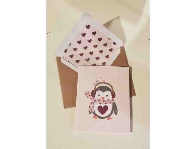 These adorable penguin cards measure 4-3/4"x 3-3/4" and come bursting with Winter Luv. Cards have a glittery cover, and envelopes sport a coordinated heart lining. 60 total cards for your 60 best friends!