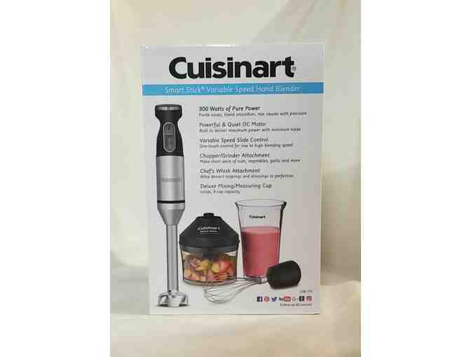 A brand new, 300-watt, Smart Stick Variable Speed Hand Blender from Cuisinart. Comes with easy-to-use attachments for chopping, grinding, and whisking.