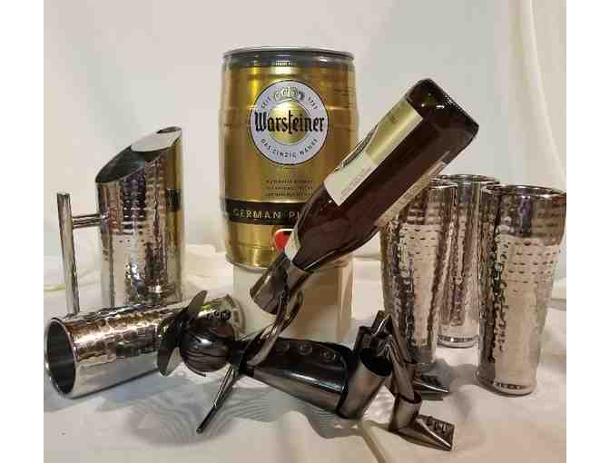 Enjoy this mini keg of authentic German Warsteiner Pilsner Beer. Basket comes complete with four mid-century, hammered stainless steel, pilsner glasses and a similarly chic pitcher for a second round.