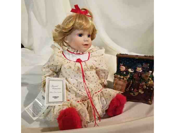 Beautiful porcelain doll in pristine condition with tags, bracelet, and slippers to commemorate a baby's first Christmas. Comes with a vintage Babes in Toyland music box.