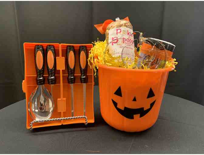 This handy basket has halloween treat accessories galore! Includes caramel corn, pumpkin-carving set, pumpkin cookie cutters, and cookie decorating set.