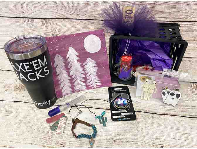 Black insulated tumbler with "Axe 'em Jacks" and SFA hand logo, Cactus bracelet and matching necklace, mini mason jar with SFA hand logo, galaxy pop socket with SFA hand logo, 2 pair of Halloween earrings, and a pine tree painting!