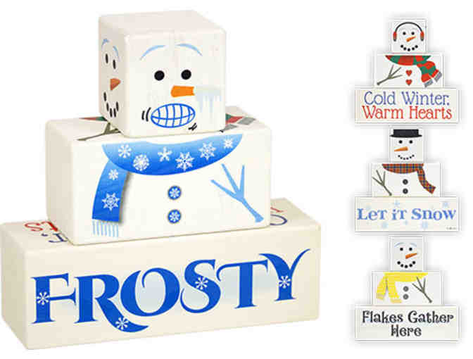 This three-block set will get you into a seasonal mood! The bottom block measures 8.25" long x 2.75" square. Printed on four sides with different messages when rotated. Four snowmen are shown - "Frosty", "Cold Winter. Warm Hearts", "Let It Snow", and "Flakes Gather Here." Mix and match the sides for more combinations! Crafted from locally-sourced, responsibly-harvested pine. Finish is waterbased stain and ink.