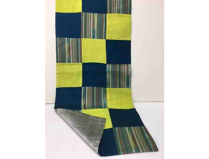 This attractive table runner is 72" long and 13" wide. The fabric comes from Myanmar (formerly Burma). The runner reverses to a sold silvery-gray with a slight sheen to it.
