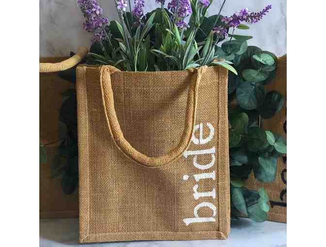 Burlap tote bags with lower case letters only. Character limit of 7-8 pending letters used. Greater than 8 characters possible at extra cost. Product Description: 100% Burlap Fabric (Jute Fabric) Fancy Soft Cotton Handles, Inner Vinyl Lining, Full Side and Bottom Gussets Size: 9" x 11" x 4"