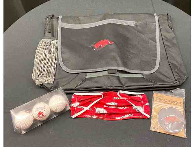 This set includes: messenger bag, mask, vintage Razorback golf balls, and a car coaster. Perfect for gifting!