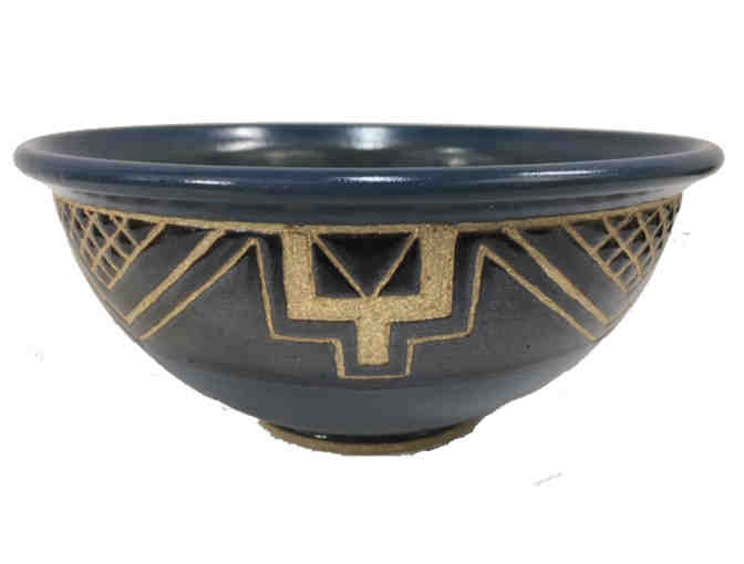 The dark lustrous glaze and carved slip decoration on this functional stoneware is created with native clay dug from the banks of Vermont rivers.