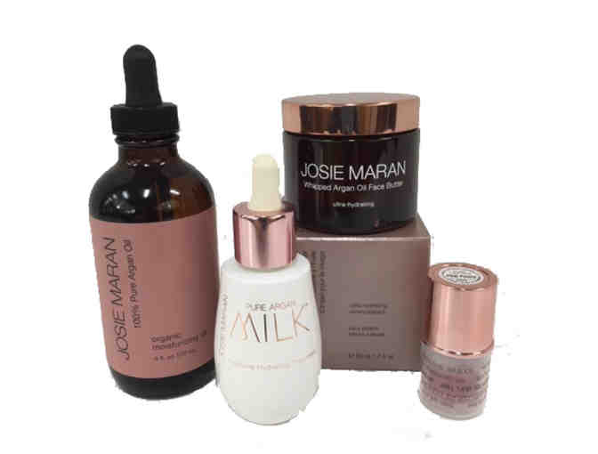 This collection of skin care products from Josie Maran includes: 100% Pure Argan Oil, Organic Moisturizing Oil 4oz Bottle Pure Argan Milk, Intensive Hydrating Treatment 1oz Bottle Argan Color Stick, Pink Peony, .21 Oz Whipped Argan Oil Face Butter, 1.7 fl. Oz Jar