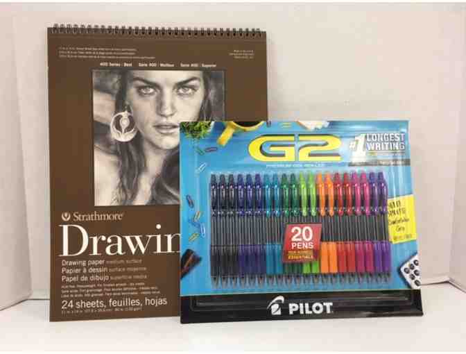Ready to get creative? This sketch pad and pens will release your imagination. The pen assortment includes 20 G2 Pilot pens in nine different colors. These pens provide a fine line and are the #1 longest lasting pens on the market. The sketch pad contains 24 sheets of 11" x 14" acid free, heavyweight paper with a medium surface.