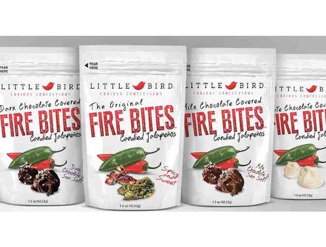 Enjoy this incredible gift basket from Little Bird Kitchen, with a sampling of their unique products. Some Products may include: Fire Syrup, a jalapeño based simple syrup - it's like honey, but with a KICK, Fire Bites are AMAZING Belgian Chocolate mixed with ground Candied Jalapeños - bringing you a perfectly hot and perfectly delicious treat, Fire Powder, Finely ground Candied Jalapeños and Lastly, a sample of one of their newest treats.