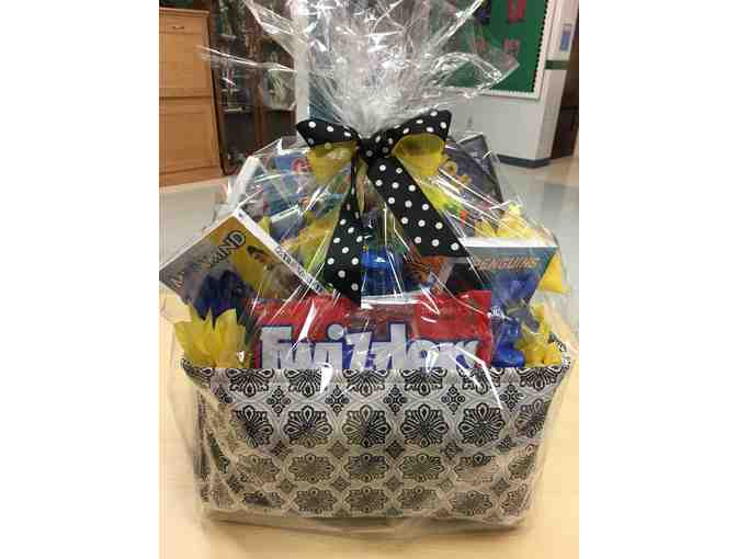 Packed with recent animation hits, this basket is sure to delight the young--and the young at heart! This collection includes The Emoji Movie, Dreamworks Penquins of Madagascar, Smurfs The Lost Village, Dr. Seuss's The Cat In The Hat, Dreamworks Megamind and Sherlock Gnomes. Enjoy the treats of the theater in the comfort of your own home when you serve PopSecret Movie Theater Butter flavor popcorn (12-pack) complete with (4) assorted Kernel Seasonings popcorn seasonings in the included popcorn bowl along with (5) assorted beverages and (7) assorted theater-size candies. Comes in a stylish patterned woven bin (black and gray design). Dim the lights and start the movie!