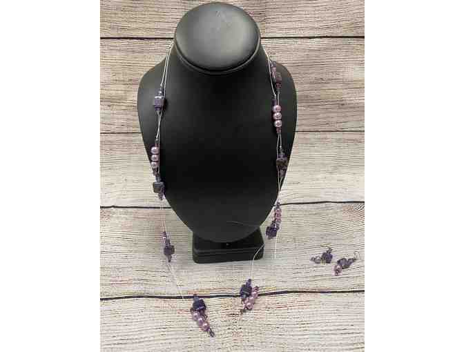 Two necklaces- purple lace agate, star cut amethyst stones. Fire polished purple glass beads and dark lavender glass pearls- all hand knotted on fine silk cords. Can be worn together or separately. Matching earrings of all the same components on sterling ear wires compliment the set. The perfect gift for your SFA Alum or student to layer atop her favorite outfits!