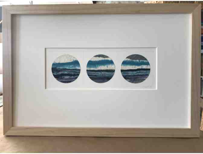 Encaustic and watercolor seascape tryptic on handmade paper. Framed in a maple frame with UV glass.