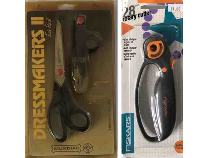 This listing is for a two-pack of Mundial scissors, dressmakers shears and thread clips (retail $41), and a Fiskars 28mm rotary cutter (retail $11). These are well known brands in sewing circles known for quality.