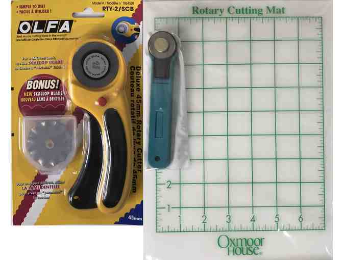 This listing is for an Olfa ergonomic 45mm rotary cutter (retail $25) and a smaller rotary cutter with a 9" x 7" Oxmoor House cutting mat (retail $10). The smaller cutter and mat are perfect for precision cuts on small quilting squares. The Olfa cutter has an ergonomic handle that fits in your hand and is helpful for arthritis sufferers. Valued at $35.