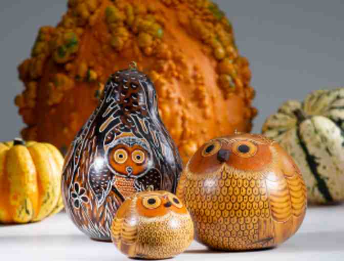 These unique owl gourd ornaments grace the cover of our 2020 catalog! Designed and hand-crafted by artists in Peru, our fair trade gourd ornaments bring modern flair to ancient, traditional hand-carving and burning techniques. Details will vary as nature and the artists intended. Set includes two large ornaments approx. 3"- 4"H and one regular size approx. 2" - 2.5"H