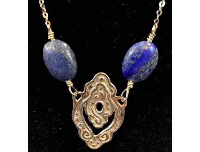 Just Breathe Fine Silver Pendant captured by Russian Lapis Lazuli stones which some believe open the wearer up to Truth and Enlightenment. Set on a Sterling Silver Cable Chain. Necklace length: 21