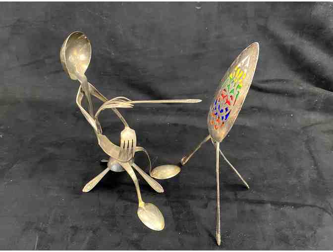 In a long tradition of artists creating artwork of people important to them, Lon Pelton has created a sculpture of his beloved wife, Jane Pelton. As well it is also a sculpture of every creative spirit. Sculpture is made from found objects, including silverware.