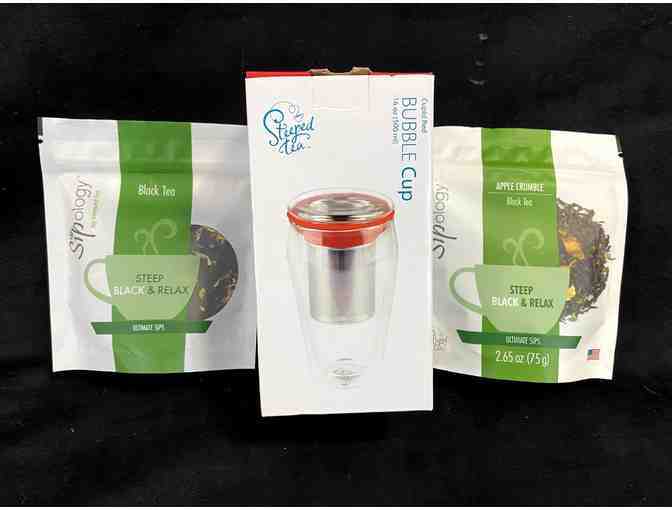 Everything you need for a refreshing tea break. A double-walled glass cup with lid and fine mesh infuser for steeping with the finest loose teas. Includes two bags of premium loose black tea.