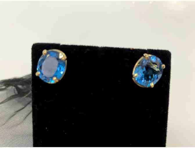 These beautiful earrings are 10x12 London Blue Topaz set in 14K yellow gold. Simple, elegant and sparkly!