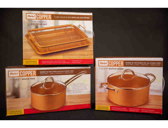 This auction item includes the Parini Copper 5 qt Dutch Oven, Copper 3qt Sauce Pan and Copper 2 piece Crispier Air Fryer