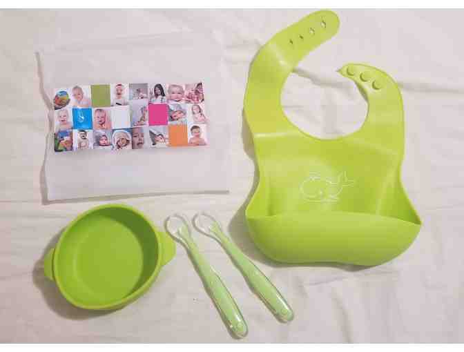 Baby feeding set in zippered silicon bag- Silicon apron, suction bowl and 2 feeding spoons. Perfect for when your baby starts to eat solids.