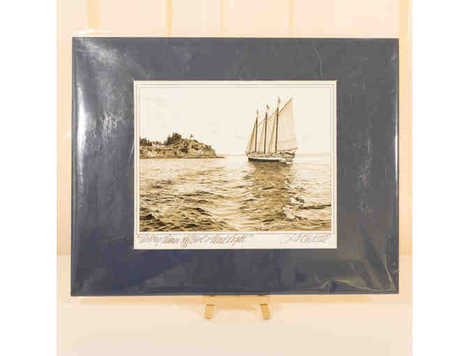 Artist J.A. Kendall print of a "sepia pen & ink wash drawing depicting the Owls Head Lighthouse and Schooner Victory Chimes under full sail.