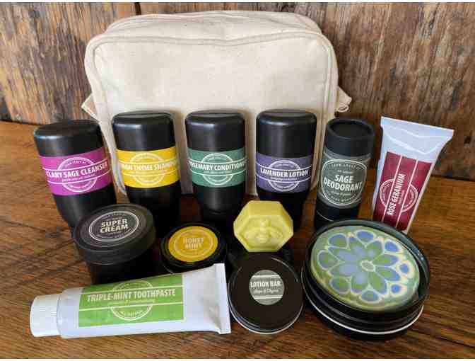 This kit contains one of each of our travel size products including Lemon Thyme Shampoo, Rosemary Mint Conditioner, 4 oz Soap in a tin, Clary Sage Cleanser, Super Cream, Sage Lotion Bar, Sage Deodorant, Honey Mint Lip Balm, and a Triple Mint Toothpaste, all in our natural canvas travel bag.