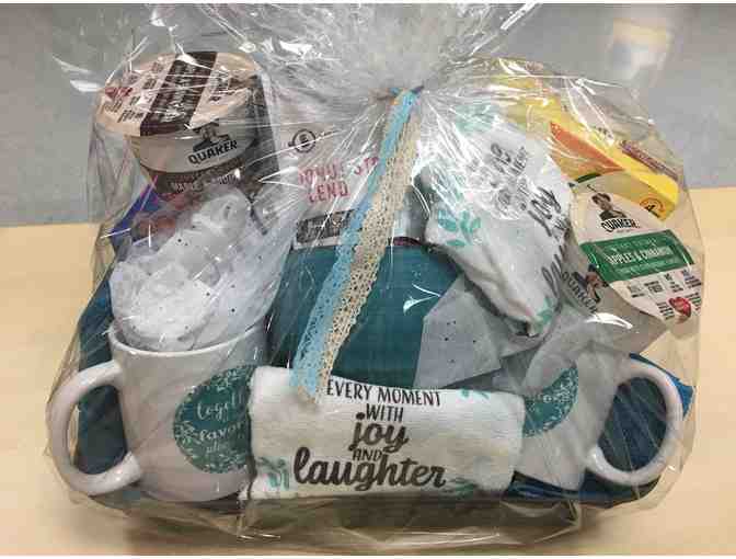 This sweet breakfast collection is sure to delight! BelVita Breakfast Cookies, (2) Quaker Instant Oatmeal Cups, Brown Sugar Cinnamon Pop-Tarts, and 12 oz. Donut Store Blend Whole Bean Coffee are tucked into a stylish Brown Woven-Look Plastic Basket. Included are (2) Cereal Bowls and matching Dish Towel and Dishcloth, along with (2) Mugs and (2) additional Dish Towels printed with homespun sentiments. Kitchen items are in a contemporary teal and brown color scheme. A great basket designed to create special morning moments!