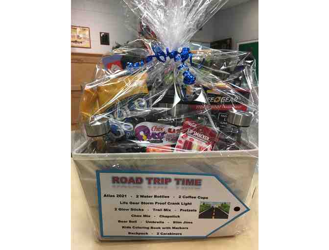 If it's "road trip time" for you or your family, you'll love this collection perfect for "hitting the road"! An open canvas tote holds great items for navigation and protection: a full-sized 2021 Atlas, Life Gear Stormproof Crank Light, Umbrella, (2) Glow Sticks, Bear Bell, (2) Carabiners and CocaCola Lip Smackers. No road trip is complete without snacks, and this collection has it covered: Trail Mix, Rold Gold Pretzels, Chex Mix, Slim Jims, (2) Water Bottles and (2) Travel Coffee Cups. Topped off with a Children's Coloring Book, Markers, and a Packable Day Pack for carrying, this basket is a unique traveller's treasure!