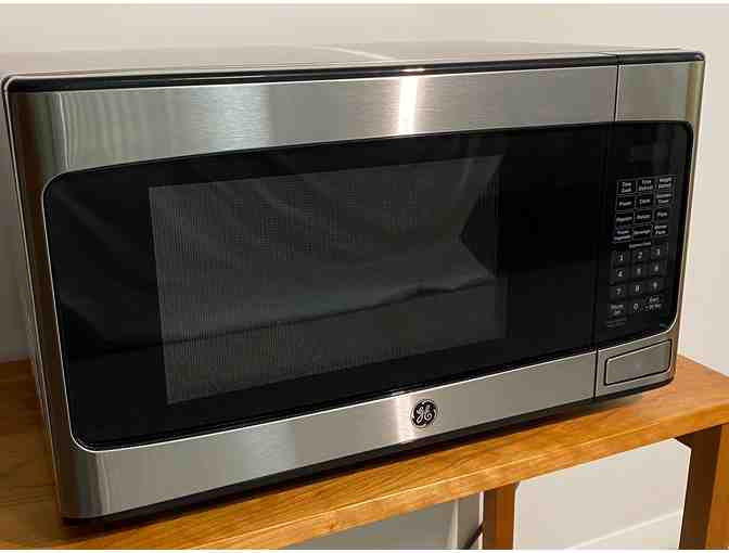 Simplify your life by cooking a wide variety of meals with this steel GE 1.1 cu. ft., 950-watt, countertop Microwave Oven. This versatile microwave has electronic touchpad controls and multiple one-touch settings. The rotating turntable and 10 power levels provide thorough cooking performance with only 950 watts of power. The microwave features weight and time defrost functions, control lockout for enhanced safety, and a timer. There are convenience cooking controls for beverage, dinner plate, pizza, popcorn, potato, and vegetable. Approximate dimensions are 12 inches high by 20 5/16 inches wide by 15 5/8 inches deep.
