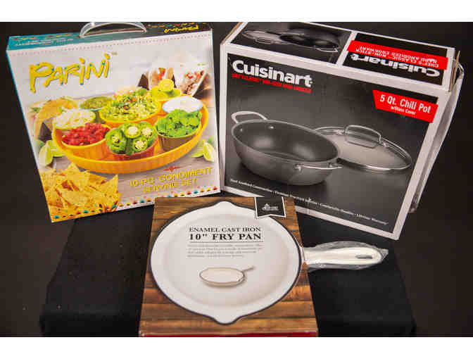 This fun set is perfect for your next "Taco Tuesday" Fiesta! It comes with a 10 piece condiment set (for all your taco toppings), a 5qt Chili Pot for that nacho sauce, and a 10" Enamel Cast Iron Skillet for those tortillas!