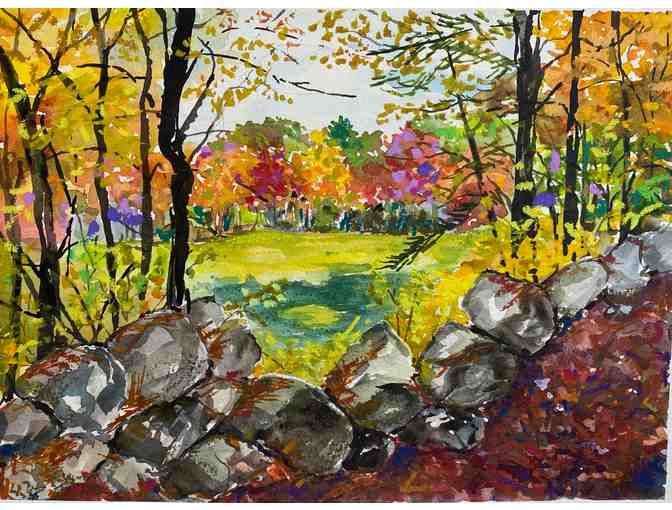This lovely work of art was done in 2020 by Groton artist Sarah Connell Campbell. The stone wall in the foreground and the leaves changing color give the piece beautiful vibrant color so typical of New England in the autumn. The painting measures 9 inches by 12 inches.