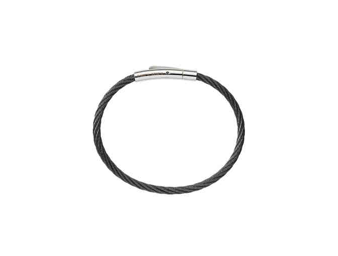 For our bracelet design, we replicated the roof's cables in Black Titanium. The cable is complimented by a stainless steel clasp. We custom-designed the clasp to be functional, sturdy and easy to take on and off with one hand. The longitude/latitude of the VeloPark is laser-etched on the clasp.