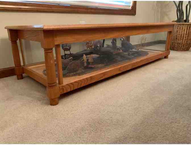 Oak and Glass Coffee Table /Display Case with hand-carved and hand-painted Quail