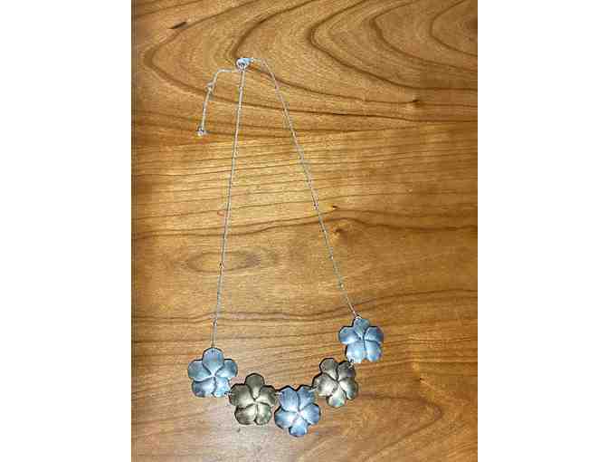 Here's a very contemporary-looking necklace that features silver and gold-colored blossoms on a chain that adjusts to three different lengths. These flowers will remind you that Spring is coming!