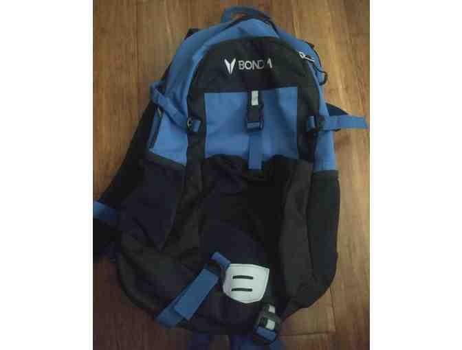 This listing is for a black and blue Bondka backpack, featuring an extra pocket inside! It also has a waist bucklet for extra stability when travelling. Measures 19" long.