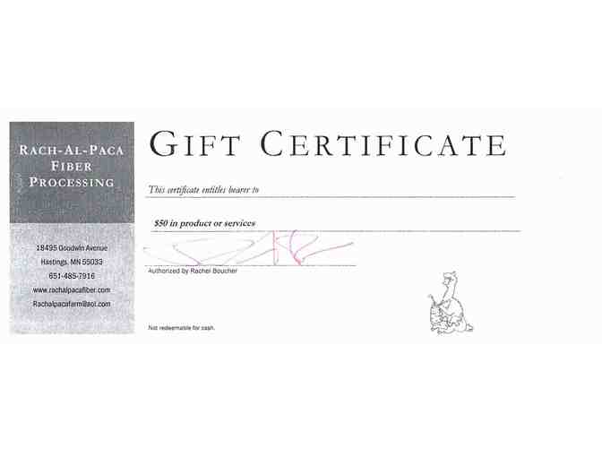 Fiber Processing Gift Certificates - 2 @ $50 each. Rach-Al-Paca Fiber Processing