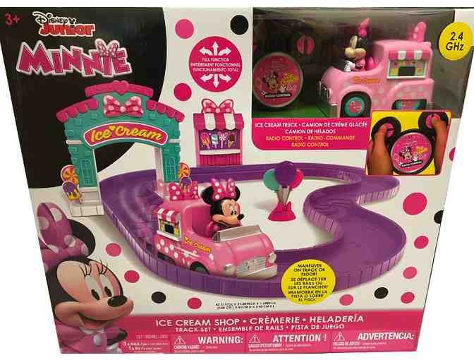 Minnie's ready to make a delivery! Maneuver her 2.4GHz radio control ice cream truck through the ice cream shop, around the track, and pass the balloon bouquet, dropping off goodies at the treat stand!