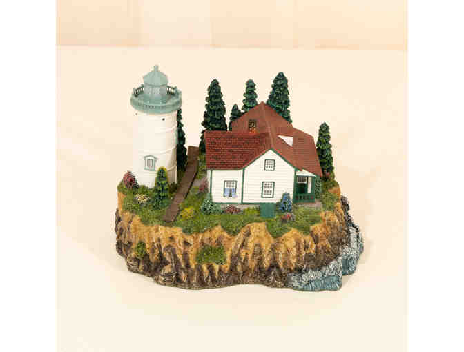 This replica of the Little River Lighthouse in Maine depicts the beautiful setting of the lighthouse and keepers house of this island light station in downeast Maine.