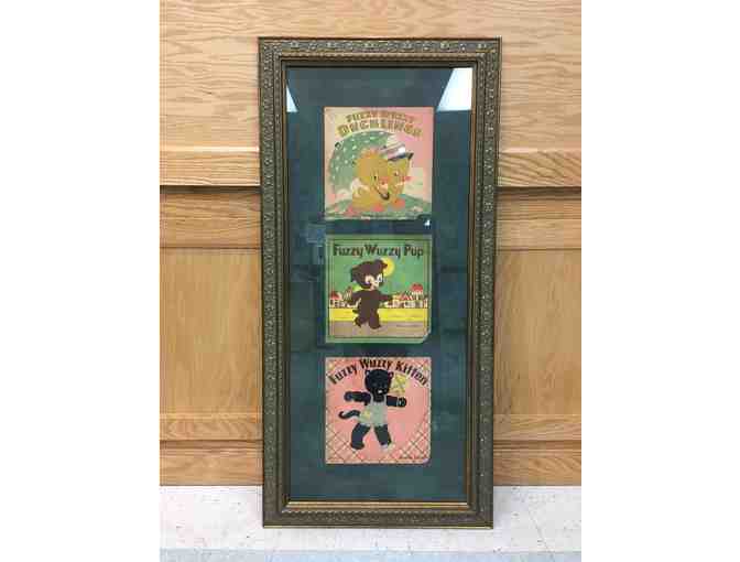 A one-of-a-kind literary decor treasure! Three vintage, complete Whitman children's books are mounted in green marbled matting, then framed in vintage gold with raised inner lip. One book cover indicates a 1945 copyright date. Finished piece measures approximately 21 1/2" X 44". Mounting and framing done by Wiseman Graphics of Herndon. A stunning piece perfect for a library or child's room.