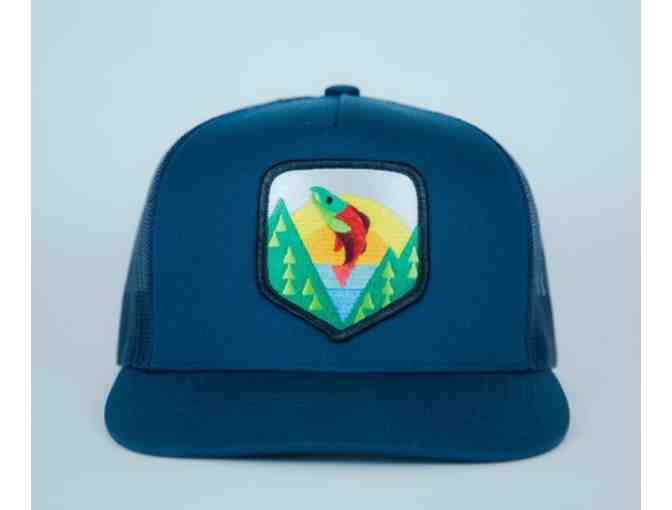 WSC Rising Sockeye Trucker hat. Emboridered patch on front of a low-pro blue hat.