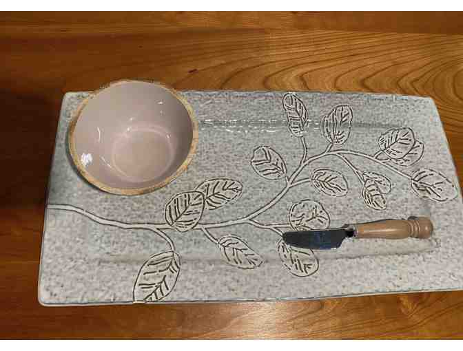 This Chip and Dip Plate is 15 inches long and 8 inches wide, with a leafy branch running across it. There is a coordinated dip bowl with a wooden exterior and a spreader knife with a wooden handle. The neutral colors make this perfect for year-round use.