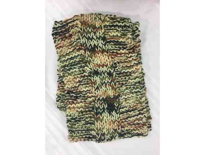 A one-of-a kind handcrafted accessory! This Hand-Knitted Acrylic Scarf comes in a camo-themed color pattern and includes the natural variations characteristic of handcrafted yarn creations. Finished length is approximately 59". Care: machine wash cold; gentle cycle recommended. Made with care by Mrs. Roberta Brosius, SCA teacher and Christian Education supporter. Stay warm this winter in style!