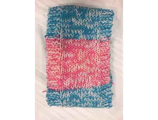 A one-of-a kind handcrafted accessory! This Hand-Knitted Acrylic Scarf comes aqau and orange stripes--just like the candy!--and includes the natural variations characteristic of handcrafted yarn creations. Finished length is approximately 66". Care: machine wash cold; gentle cycle recommended. Made with care by Mrs. Roberta Brosius, SCA teacher and Christian Education supporter. Stay warm this winter in style!