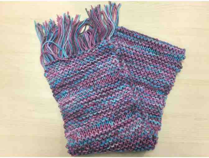 A one-of-a kind handcrafted accessory! This Hand-Knitted Acrylic Scarf comes in a variegated mauve/blue/gray color scheme with matching fringes and includes the natural variations characteristic of handcrafted yarn creations. Finished length is approximately 58". Care: machine wash cold; gentle cycle recommended. Made with care by Mrs. Roberta Brosius, SCA teacher and Christian Education supporter. Stay warm this winter in style!