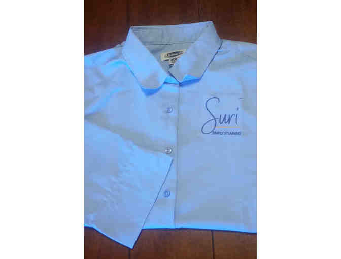 Shirt - Women's poplin w/ Suri Simply Stunning brand mark (blue - women's med)