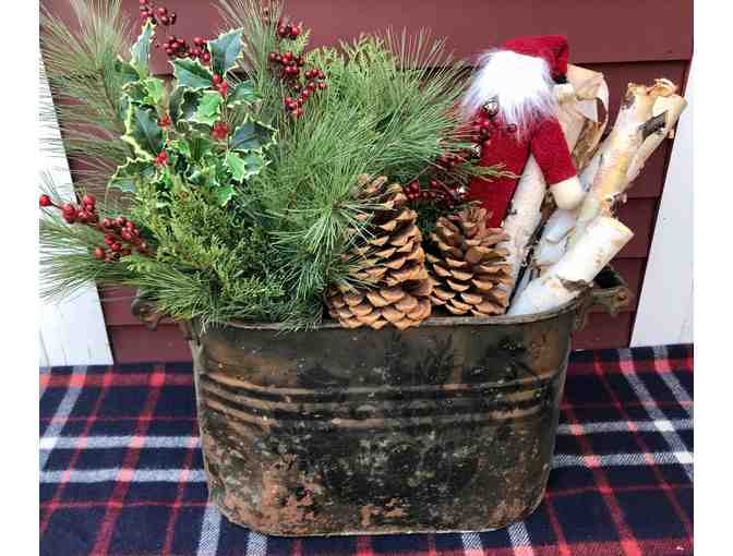 Perfect for your front porch or hearthside, this bucket is filled with fresh white pine, cedar and juniper along with white birch logs, giant pinecones, red berries, sprigs of holly and a country primitive Santa. The fresh greens are in a bucket with oasis and water for you to enjoy all season long. The measurements are approximately 24" long x 14" wide x 26" high.