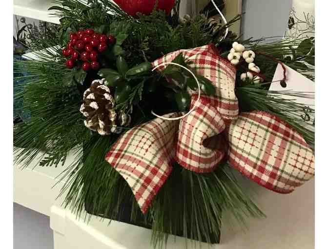 This arrangement is a bit larger than the small basket option and is perfect as a small seasonal centerpiece or for a coffee table or small side table. Each basket, wood or tin box, or decorative container is unique - filled with fresh white pine, cedar and juniper and is decorated with a seasonal bow, red or white berries, pinecones, shiny balls or bells and a sweet bird. Keep the oasis watered and this arrangement will last 6 weeks plus.